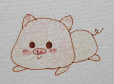 今回はブタさんのほっぺのふっくらした感じを出したかったので、丸ではなく、丸みを帯びた台形を頭にしました。胴体は、丸みを帯びた短めの長方形にクルンとした尻尾をつけて完成です。